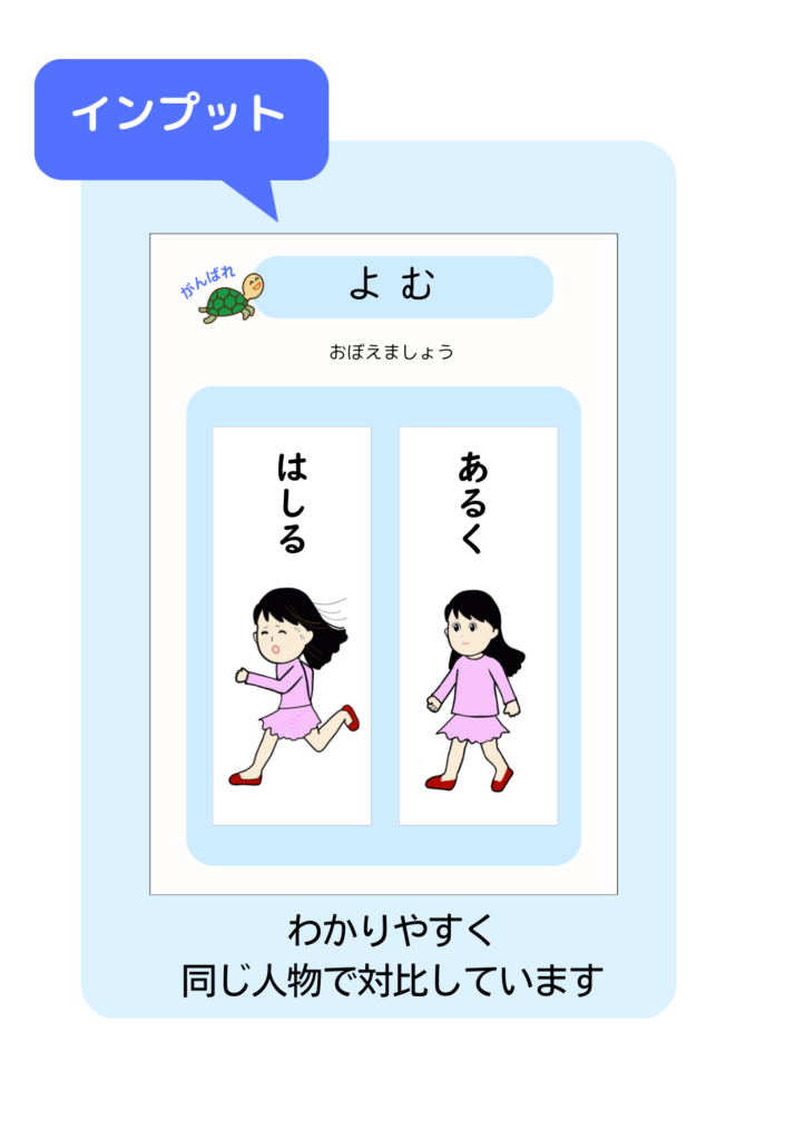 「ふとい+ほそい」 「おとこ+おんな」 「はしる+あるく」 「ある+ない」 など2つを対比することにより理解しやすい内容が沢山あります。「ゆっくり亀さん」の教材はこの対比シリーズだけでなく、基本的にこの考え方が基本となっているため、非常にわかりやすく、また迷いやすい教材は何度もやり直しわかりやすくしております。動詞の場合も「たつ+すわる」で対比しておぼえるのが、わかりやすいです。